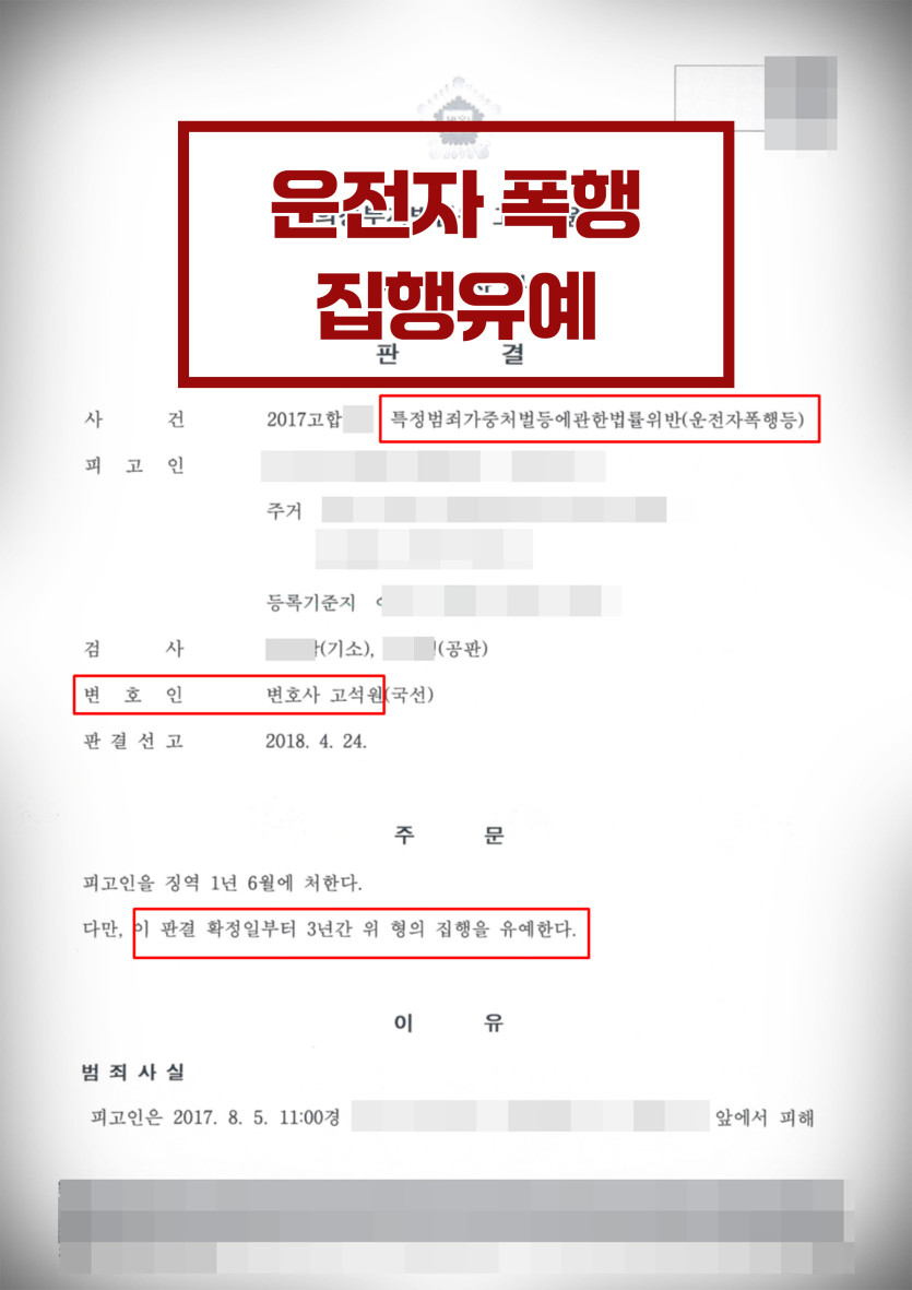 [특가법 위반(운전자 폭행)] 택시기사 상해 집행유예로 방어