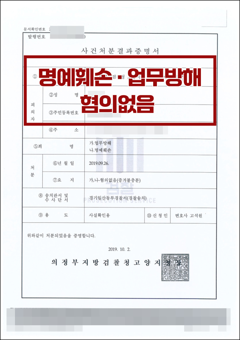 [업무방해·명예훼손] 검찰 단계 "혐의 없음"으로 방어한 사례