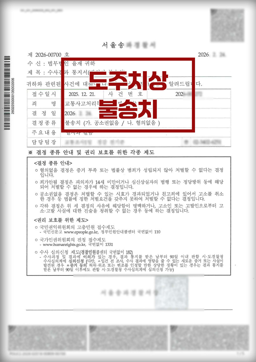 경찰 단계 '불송치 결정'과 '면허취소 행정처분 취소'로 방어하였습니다.