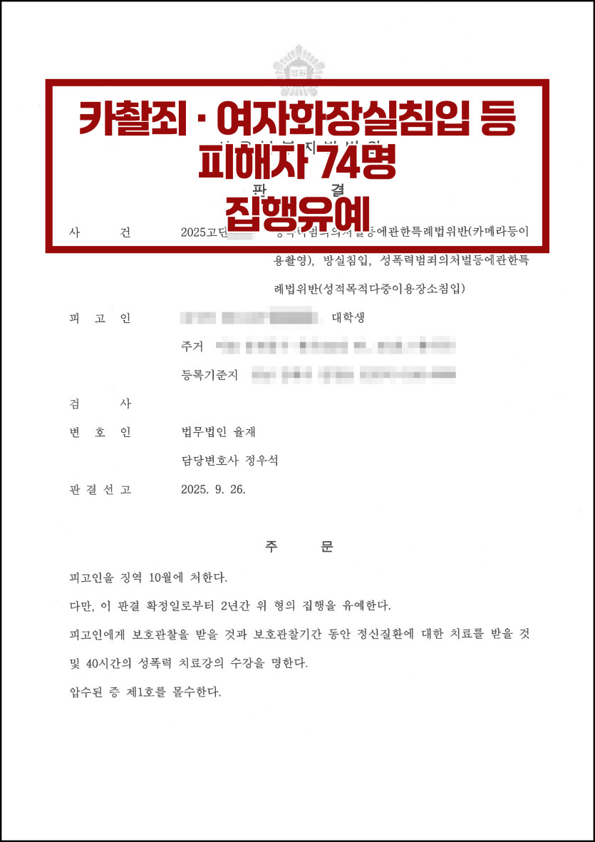 [카메라등이용촬영죄 등] 카쵤죄·성적목족다중이용장소침입, 집행유예 방어